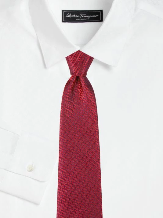 A sophisticated pattern decorates this necktie woven from pure silk.