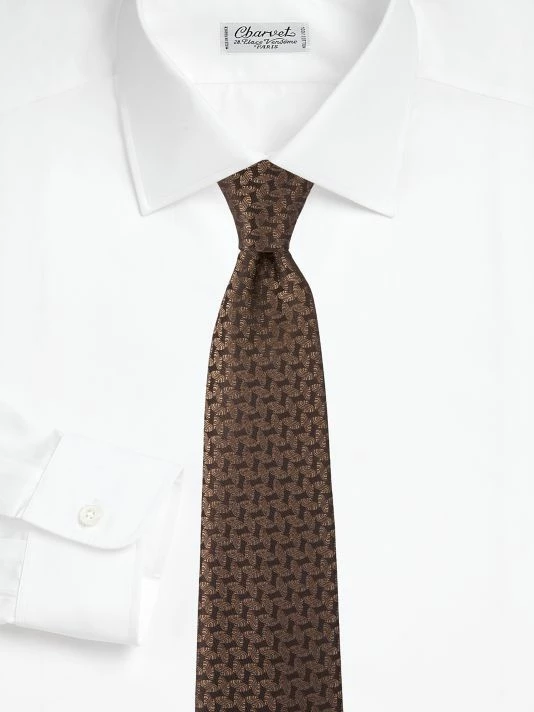A rich geometric motif is patterened throughout this rich silk tie.