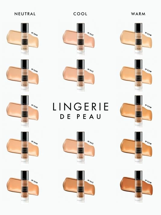 Its fresh, light texture glides onto the contours of the face like a second skin to enhance beauty naturally, without artifice, all day long. Guerlain Technology, Bio-Fusion micro-mesh, an unprecedented combination of contouring and smoothing stretch fibres with natural silk and linen fibres that are in total affinity with skin. Hydrating agents bring softness and comfort throughout the day. Lingerie de Peau is offered in a universal range comprising 18 ultra-natural shades for every skin tone: cool, neutral and warm. Lingerie de Peau is sold in a 30 ml pump dispenser. WITH SUNSCREEN BROAD SPECTRUM SPF 20.