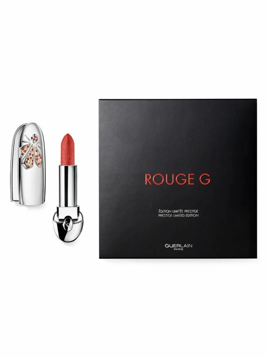 Discover Rouge G Prestige Limited Edition, an exclusive gift set, that includes a jewelled case inspired by the bee—the legendary symbol of the House of Guerlain—and a lipstick shade in a satin finish. This trendy and majestic double mirror case is adorned in sparkling embellishments transforming your Rouge G lipstick into a work of art — a couture collectible. Created by the famous jeweller Lorenz Baumer, the Shiny Bee case celebrates the bee in all its glory and is dotted by hand with precious rhinestones. The bee design symbolizing Guerlain’s heritage, inspiring it’s designs, and driving it’s commitment to protecting bees and sustainable development. The satin lipstick provides a luminous brick-red hue that is creamy and comfortable long-lasting finish.