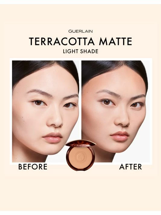 Using Guerlain’s signature 3 gesture, apply with the Terracotta brush by tracing a figure three on each side of the face. Start by sweeping across the forehead, down and around the cheekbones, then down along the jaw line to the chin.